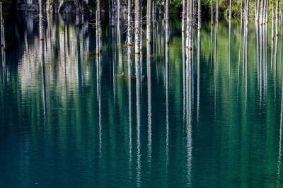 Вода в озере холодная (температура не превышает 6 градусов даже летом), оттого такая красиво-голубая и оттого деревья не разложились, а продолжают живописно стоять.
